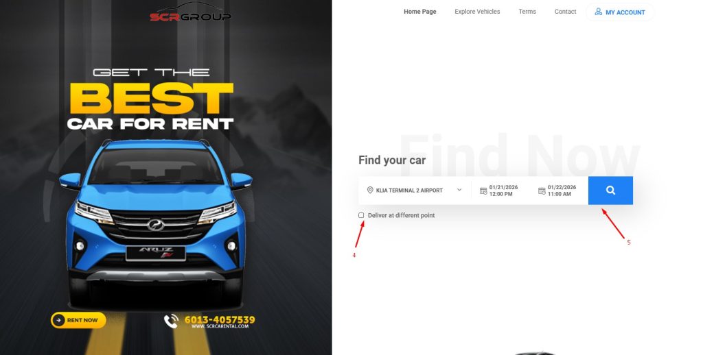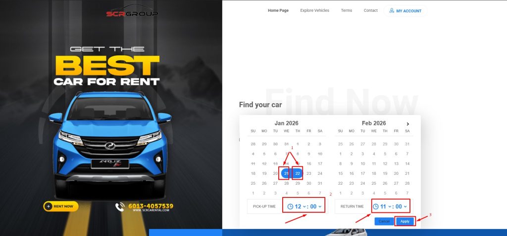 - Choose Pickup Date and Drop Off Date (additional charge will be impose if different location, please refer terms for related location)
